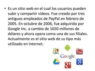 YouTube es un sitio web creado en 2005 para compartir videos. Fue adquirido por Google en 2006 y se ha convertido en la plataforma más popular para ver y subir videos. Los usuarios pueden ver videos en diferentes calidades y los creadores de contenido pueden ganar ingresos a través del programa YouTube Partners.