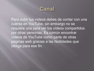 YouTube es un sitio web lanzado en 2005 que permite a los usuarios compartir videos en línea de manera gratuita sin necesidad de descargarlos. Los usuarios pueden crear una cuenta para subir sus propios videos, pero no se requiere cuenta para ver los videos que comparten otros. YouTube fue adquirido por Google en 2006 y sus videos a menudo se incluyen en otras páginas web.