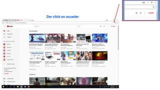 Este documento proporciona instrucciones para subir un video a YouTube desde Google Chrome. Explica cómo hacer clic en el canal de YouTube para acceder a la opción de subir un video, luego hacer clic en la imagen del video o arrastrar el archivo desde el explorador. Mientras se carga el video, se pueden configurar detalles como el nombre, la descripción, la privacidad y las etiquetas. Finalmente, muestra las opciones para compartir el video una vez cargado y acceder a la lista de videos en el canal.
