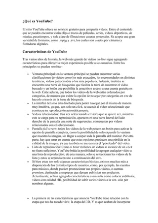 ¿Qué es YouTube? Elsitio YouTube ofrece un servicio gratuito para compartir videos. Entre el contenido que se pueden encontrar están clips o trozos de películas, series, videos deportivos, de música, pasatiempos, y toda clase de filmaciones caseras personales. Se acepta una gran variedad de formatos, como .mpeg y .avi, los cuales son usados por cámaras y filmadoras digitales. Características de YouTube Tras varios años de historia, la web más grande de videos on-line sigue agregando características para ofrecer la mejor experiencia posible a sus usuarios. Entre las principales se pueden nombrar: Ventana principal: en la ventana principal se pueden encontrar varias clasificaciones de videos como los más estacados, los recomendados en distintas temáticas, videos patrocinados o los más populares. Además, también se encuentra una barra de búsquedas que facilita la tarea de encontrar el video buscado y un botón que posibilita la creación o acceso a una cuenta gratuita en la web. Cabe aclarar, que todos los videos de la web están ordenados por categorías, de manera que existe la opción de navegar por categorías en vez de hacerlo a través de la barra de búsqueda. La interfaz del sitio está diseñada para poder navegar por el mismo de manera muy intuitiva, ya que, con solo un click, se accede al video seleccionado que comienza su reproducción automáticamente. Videos relacionados: Una vez seleccionado el video que se quiere ver, mientras este se carga para su reproducción, aparecen en una barra lateral del lado derecho de la pantalla una serie de sugerencias, compuestas por videos relacionados con el seleccionado. Pantalla full screen: todos los videos de la web poseen un botón para activar la opción de pantalla completa, como la posibilidad de solo expandir la ventana que muestra la imagen, sin llegar a ocupar toda la pantalla del monitor. Por otra parte, hay que tener en cuenta que estas opciones producen una pérdida en la calidad de la imagen, ya que también se incrementa el “pixeleado” del video. Lista de reproducción: Como si tener millones de videos al alcance de un click no fuera suficiente, YouTube brida la posibilidad de agregar cualquier video a una lista de reproducción; de esta manera, solo se seleccionan los videos de la lista y estos se reproducen uno a continuación del otro. Si bien estas son solo algunas características básicas, existen muchas más a disposición de los distintos tipos de usuarios, como, por ejemplo, las cuentas para músicos, donde pueden promocionar sus propios videos, o cuentas premium, destinadas a empresas que deseen publicitar sus productos. Actualmente, se han agregado características avanzadas como colocar subtítulos, videos con calidad HD, posibilidad de subir varios videos a la vez, solo por nombrar algunas. La primera de las características que anuncia YouTube tiene relación con la etapa que nos ha tocado vivir, la etapa del 3D. Y es que acaban de incorporar