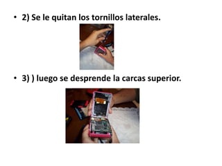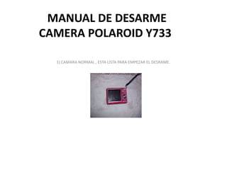 El documento proporciona instrucciones detalladas para desarmar y limpiar una cámara Polaroid Y733. Explica los 28 pasos para quitar la carcasa, desmontar las piezas internas como el condensador y la tarjeta, limpiar cada componente, y luego volver a armar la cámara colocando las piezas en orden inverso. El objetivo final es desarmar completamente la cámara, limpiarla de polvo, y luego volver a armarla para que funcione correctamente.