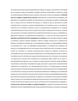 Este documento trata sobre las herramientas y elementos para mejorar la calidad en los equipos de trabajo. Explica que el trabajo en equipo efectivo requiere un comportamiento integrador que depende de la cantidad y calidad de información intercambiada, el grado de colaboración y la toma de decisiones conjuntas. También describe los componentes de trabajar en equipo como la interdependencia positiva, la responsabilidad individual y la interacción cara a cara. Finalmente, concluye que aprender a trabajar en equipos integrados ayuda a los futuros directivos