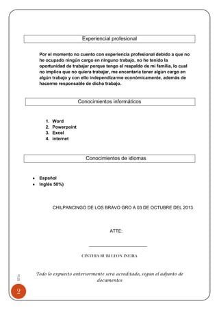 Este currículum vitae proporciona información personal y profesional de Cinthia Rubí León Ineira. Actualmente está cursando el primer semestre de la licenciatura en Ciencias de la Educación en Chilpancingo de los Bravo Gro, México. No tiene experiencia laboral formal debido al apoyo económico de su familia, pero le gustaría independizarse financieramente a través de un empleo. Domina programas como Word, PowerPoint y Excel, e incluso tiene un nivel básico de inglés.