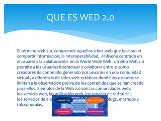 El documento describe la Web 2.0, que permite a los usuarios interactuar y colaborar como creadores de contenido en comunidades virtuales, a diferencia de sitios estáticos. Explica algunas herramientas comunes de la Web 2.0 como blogs, redes sociales y wikis. También señala que la Web 2.0 puede mejorar la participación e integración entre grupos y fomentar redes sociales y colaboración entre organizaciones con objetivos similares. Finalmente, enumera diferentes tipos de blogs.