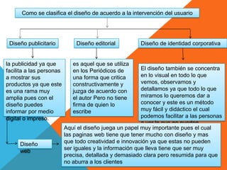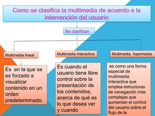 El documento clasifica la multimedia según la intervención del usuario en multimedia lineal, multimedia interactiva y multimedia hipermedia. También clasifica el diseño según la intervención del usuario en diseño publicitario, diseño editorial y diseño de identidad corporativa. Explica brevemente cada una de estas clasificaciones.