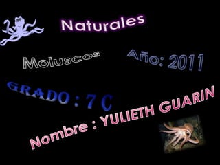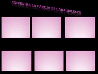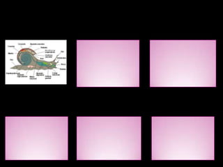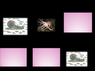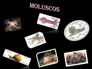 El documento clasifica los animales en vertebrados e invertebrados. Dentro de los invertebrados, los moluscos son el grupo más numeroso después de los artrópodos e incluyen almejas, ostras, calamares, pulpos, babosas y una gran diversidad de caracoles marinos y terrestres.