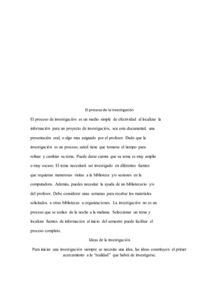 1) El documento describe el proceso de investigación, incluyendo la selección de un tema, la recopilación de información de múltiples fuentes como bibliotecas y la Internet, y el tiempo necesario para completar el proceso.