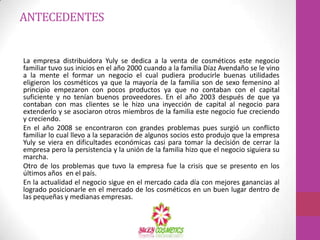 La misión de la empresa Yuly Cosmetics es proveer productos de belleza para mujeres en Veracruz para que se vean más atractivas. Su visión es posicionarse bien en el mercado de cosméticos en la región. La empresa familiar se fundó en 2000 y ha crecido a lo largo de los años a pesar de enfrentar problemas familiares y la crisis económica. Actualmente busca organizar su información en una base de datos para facilitar las ventas y transacciones.
