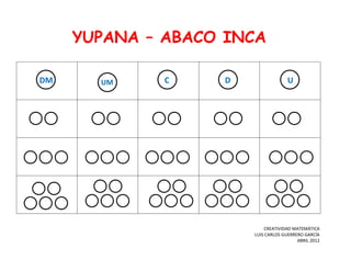 El documento describe un yupana, un abaco inca usado para realizar cálculos matemáticos. El yupana consistía en una tabla con filas y columnas donde se colocaban piedras o semillas para representar cantidades y realizar sumas, restas, multiplicaciones y divisiones. El yupana evidencia la creatividad matemática de los incas y su habilidad para desarrollar herramientas para resolver problemas numéricos antes de la llegada de los europeos.