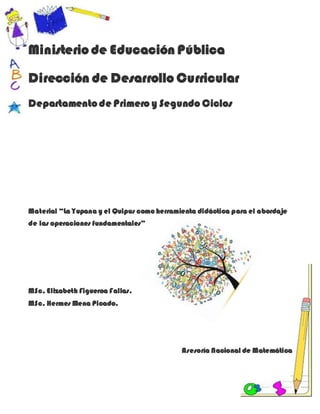 Este documento describe el uso de la yupana y el quipu como herramientas didácticas para enseñar operaciones matemáticas fundamentales a niños y niñas. Explica el contexto histórico y el funcionamiento de la yupana y el quipu en la civilización inca. Luego muestra ejemplos detallados de cómo realizar sumas, restas, multiplicaciones y divisiones usando estas herramientas. El objetivo es apoyar a los docentes con ideas creativas para enseñar matemáticas de una manera dinám