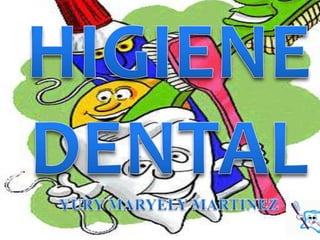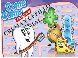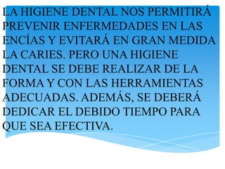 El documento habla sobre la importancia de la higiene dental para prevenir enfermedades de las encías y caries. Explica los tipos de dentición, partes del diente, técnicas de cepillado, uso de hilo dental, hábitos alimenticios saludables y enfermedades como la gingivitis. También menciona diferentes productos para el cuidado dental como cremas, enjuagues y cepillos.