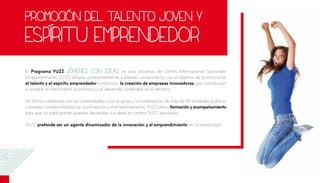 El Programa YUZZ Jóvenes con Ideas es una iniciativa del Centro Internacional Santander Emprendimiento dirigida a jóvenes universitarios para promover el espíritu emprendedor y la creación de empresas innovadoras. A través de más de 20 centros asociados, ofrece formación y acompañamiento a los participantes para desarrollar sus ideas empresariales con el apoyo de expertos y mentores. El programa tiene una duración de siete meses y ofrece premios locales y nacionales a los mejores proyectos.