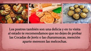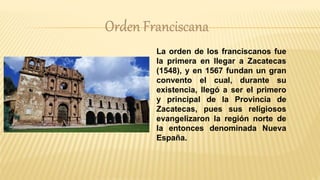 El documento describe la historia de la llegada de las órdenes franciscana y agustina a Zacatecas en los siglos XVI y XVII. Los franciscanos fundaron un gran convento en 1567 para evangelizar la región, mientras que los agustinos construyeron un primer templo modesto en 1575 y uno mayor en 1590. También se menciona que la economía de Zacatecas se basa principalmente en la minería de plata y zinc, asi como la agricultura.