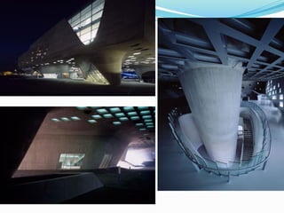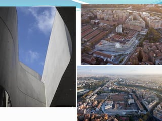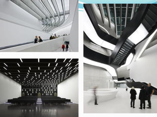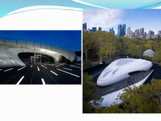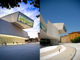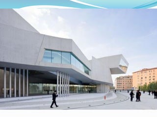 Zaha Hadid nació en 1950 en Irak y se graduó en arquitectura en el Reino Unido. Es conocida por su estilo deconstructivista, que utiliza formas angulosas y volúmenes dinámicos. Algunos de sus principales proyectos incluyen el Centro de Arte Rosenthal en Cincinnati, el Centro de Ciencias Phaeno en Alemania y el Centro Nacional de Arte Contemporáneo MAXXI en Roma. Ha recibido numerosos premios de arquitectura, incluido el Premio Pritzker en 2004.