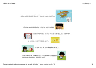 El documento narra la historia de Zamba, un niño de Formosa que viaja accidentalmente al pasado y termina en España en 1810. Allí se encuentra con que Napoleón Bonaparte ha capturado al rey de España e intenta dominar el país. Zamba conoce a patriotas que luchan contra los franceses y planean un cabildo abierto para votar si se mantiene al virrey Cisneros o se forma una junta de gobierno. Finalmente gana la propuesta de los patriotas y se forma la Primera Junta Patria.