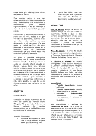 El estudio evaluó el estado nutricional de 32 niños entre 1-5 años en un centro de atención infantil en Zamora Huayco mediante medidas antropométricas. Los autores calcularon los índices de peso/edad, talla/edad y peso/talla para cada niño, y compararon los resultados con parámetros normales. Los resultados mostraron que la mayoría de niños tenían un estado nutricional normal o desnutrición leve, lo que indica que el estado nutricional en general era relativamente bueno a pesar de factores socioeconómic