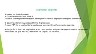 1) El documento describe el diseño de cimentaciones combinadas para columnas muy cercanas. 2) Explica que las cimentaciones combinadas se usan cuando las columnas están muy juntas o cerca de los límites de la propiedad. 3) Detalla el procedimiento de diseño que incluye determinar la distribución de presiones, el ancho requerido, verificar la capacidad portante del suelo y flexión.