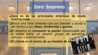 Zara, una de las principales empresas de moda internacional, se centra en la satisfacción del cliente y la creación de productos de alta calidad, manteniendo una estrategia de producción y distribución que permite una rápida adaptación a las tendencias del mercado. Fundada en 1975, ha crecido hasta operar más de 2,000 tiendas en 88 países, destacándose por su modelo de 'fast-fashion' que reduce el ciclo de diseño a 15 días. Además, Zara promueve la sostenibilidad y la responsabilidad social a través de un estricto código de conducta para sus proveedores.