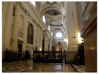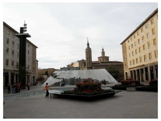 El documento describe varios lugares y monumentos importantes de la ciudad de Zaragoza, España, incluyendo la Basílica del Pilar, la Plaza de las Catedrales con la Catedral de La Seo y el Monumento a Goya, el Puente de Piedra, la Torre de la Magdalena, y el palacio real Aljafería con su patio de los Naranjos y salón del trono.