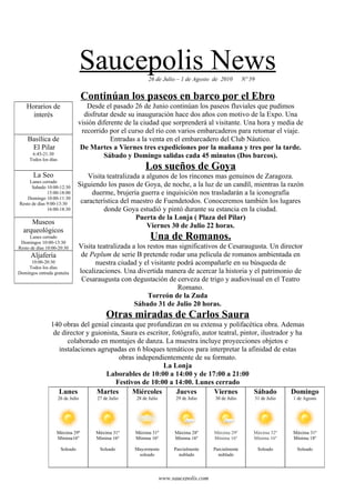 El documento resume varios eventos culturales y actividades de ocio que tendrán lugar en Zaragoza entre el 26 de julio y el 1 de agosto, incluyendo paseos en barco por el Ebro, visitas teatralizadas sobre Goya y la época romana, y una exposición sobre la obra de Carlos Saura. También incluye los horarios de apertura de lugares de interés como la Basílica del Pilar, la Seo y museos arqueológicos.