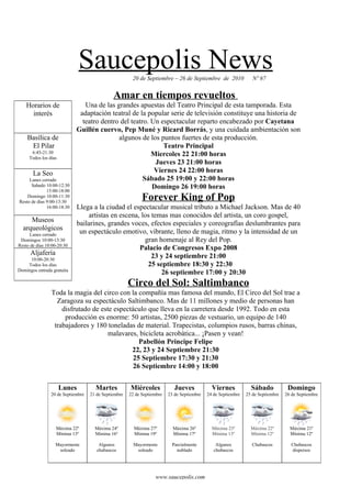 Este documento presenta varios eventos culturales y lugares de interés en Saucepolis durante la semana del 20 al 26 de septiembre de 2010. Incluye una adaptación teatral de la serie de televisión "Amar en tiempos revueltos", un musical tributo a Michael Jackson llamado "Forever King of Pop", y una presentación del Circo del Sol llamada "Saltimbanco". También proporciona horarios para sitios como la Basílica de El Pilar, museos arqueológicos y la Aljafería. Por último, incluye el pronó