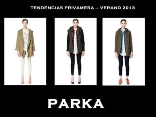 Las principales tendencias de moda para la primavera y verano de 2013 incluyen parkas, impresos étnicos y estampados de animales. Los colores negro y blanco también serán populares durante la temporada.