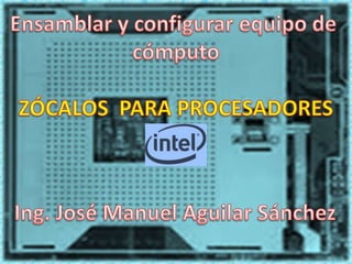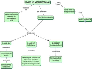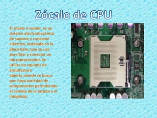 El zócalo es un sistema electromecánico de soporte y conexión eléctrica instalado en la placa base para fijar y conectar el microprocesador. Se utiliza en equipos de arquitectura abierta donde hay variedad de componentes que se pueden cambiar. El zócalo va soldado a la placa base para conectar eléctricamente el procesador según unos puntos de guía para alinear cada pin.