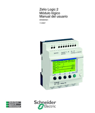 El documento es un manual de usuario para el módulo lógico Zelio Logic 2, que ofrece una guía completa sobre su conexión, configuración y funcionamiento. Incluye secciones sobre seguridad, características del dispositivo, menús de programación, diagnóstico y ejemplos de aplicación. También proporciona información técnica, preguntas frecuentes y un glosario para facilitar la comprensión del uso del dispositivo.