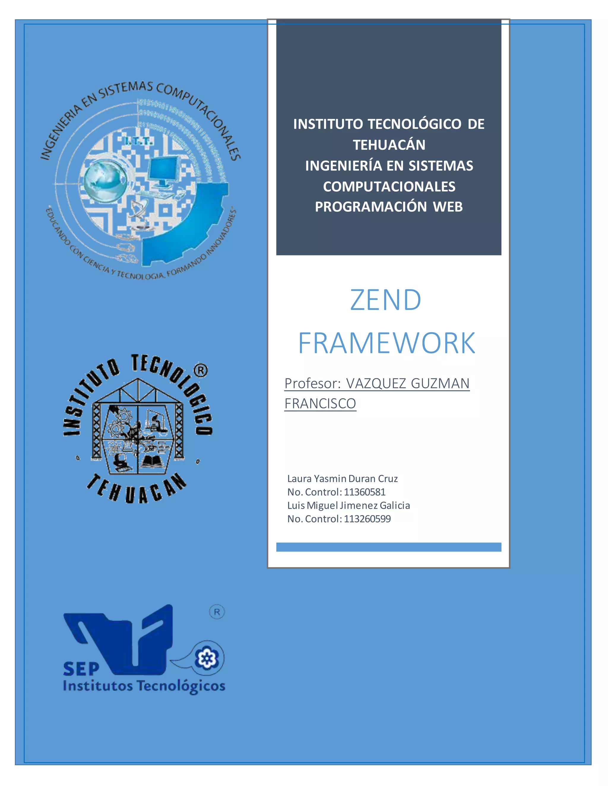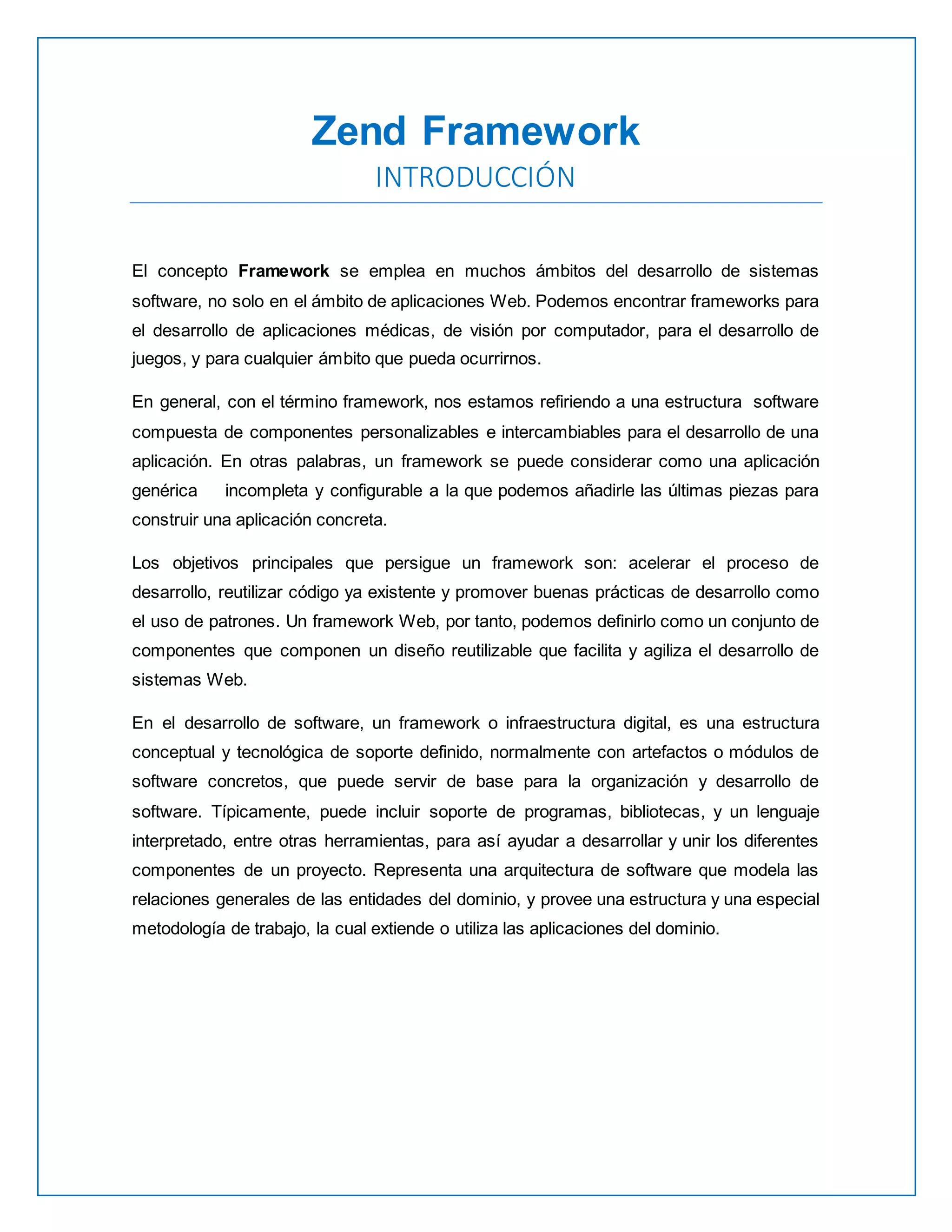 El documento describe la instalación y uso básico del framework Zend. Explica que Zend Framework es un framework de código abierto para PHP que implementa el patrón MVC y tiene componentes con bajo acoplamiento. Detalla los pasos para instalar Zend Framework usando Composer, como crear un controlador y vista básicos, y ejecutar la aplicación en un navegador.