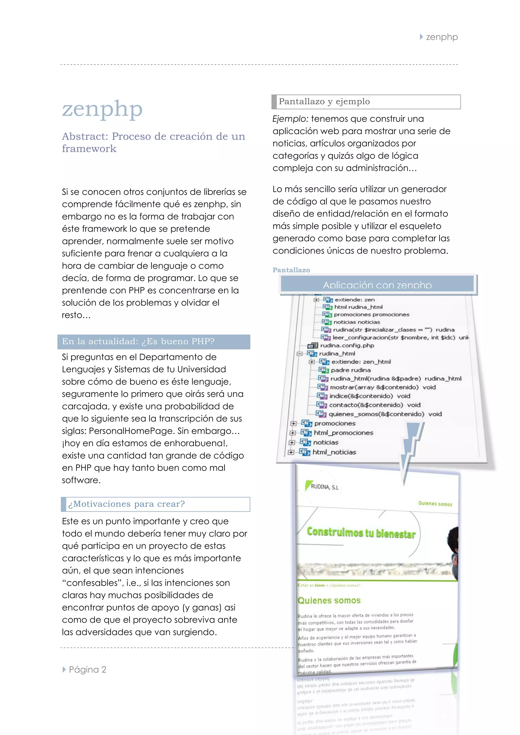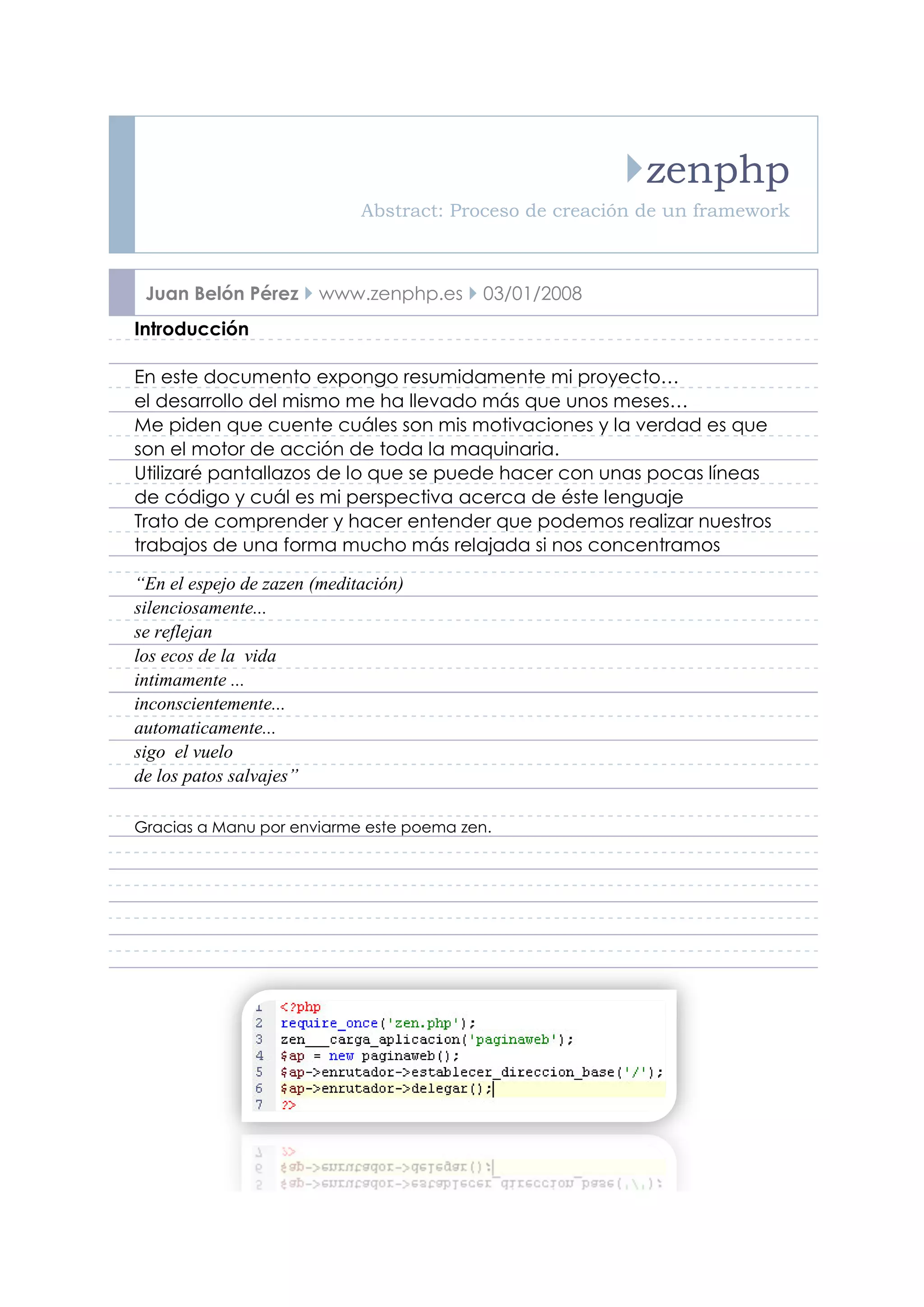 Este documento resume el proceso de creación de un framework PHP llamado zenphp. Explica que el framework fue desarrollado para facilitar la creación de aplicaciones web complejas de manera más sencilla y relajada. Muestra un ejemplo de cómo se puede generar fácilmente el esqueleto de una aplicación para gestionar noticias y artículos con zenphp. El autor también discute sus motivaciones para crear el framework y enfatiza la importancia de tener claras las intenciones detrás de un proyecto de este tipo.