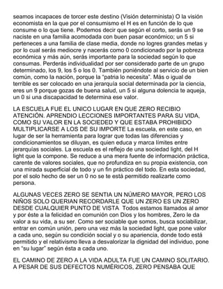 El documento habla sobre la dignidad inherente de cada persona y cómo la sociedad a menudo clasifica y juzga a las personas en función de factores como la riqueza, la salud o el género. Relata la historia de Zero, un hombre que sufre discriminación por ser considerado un "cero" en la sociedad. A pesar de esto, Zero encuentra el amor y la aceptación en una mujer y juntos tienen un hijo, desafiando las normas sociales. Sin embargo, la comunidad se enfurece y los separa por violar las reglas.