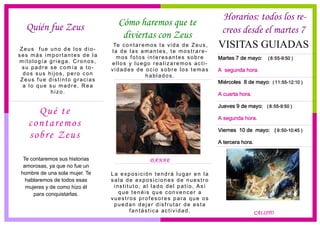 El documento describe una exposición sobre las amantes de Zeus en la mitología griega. La exposición incluirá fotos e historias sobre las mujeres con las que Zeus tuvo relaciones, como Dánae y Calisto, así como actividades recreativas relacionadas. Se llevará a cabo en la sala de exposiciones de la escuela durante los recreos a partir del martes 7.