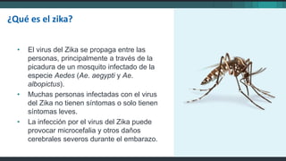 El documento habla sobre el virus del Zika. Se transmite principalmente a través de la picadura de mosquitos infectados o de una mujer embarazada a su feto. Aunque muchas personas infectadas no presentan síntomas o solo tienen síntomas leves, la infección durante el embarazo puede causar microcefalia y otros daños cerebrales al feto. No hay una vacuna ni un tratamiento específico para el Zika.