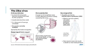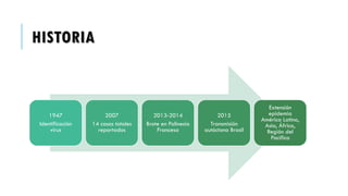Este documento presenta información sobre el virus Zika y su impacto en el embarazo. Explica que el Zika se transmite principalmente por la picadura del mosquito Aedes aegypti y Aedes albopictus. Puede causar microcefalia y otras anomalías cerebrales en los fetos si la madre se infecta durante el embarazo. Se recomienda que las mujeres embarazadas que viven en áreas endémicas eviten las picaduras de mosquitos y usen repelentes para prevenir la infección. El diagnóstico en la madre se real