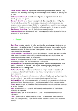 Este documento resume el cómic de Zipi y Zape, describiendo los personajes principales como los gemelos Zipi y Zape, sus familias y compañeros de escuela. Explica que la historia se desarrolla en escenarios realistas como la casa y la escuela de los protagonistas durante el siglo XX, y que fue creada por el autor español José Escobar en 1948.