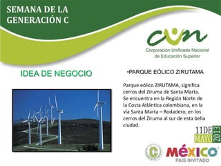 El Parque Eólico Zirutama, ubicado en Santa Marta, Colombia, consistirá en 15 aerogeneradores que proporcionarán energía limpia y renovable a la comuna 1 de la ciudad. Este proyecto busca fomentar la conciencia ecológica y ofrecer un espacio recreativo, con un costo total estimado de 100 millones de dólares. Su modelo de negocio se basa en la venta de energía a través de un acuerdo con las Empresas Públicas de Medellín (EPM) y se promocionará mediante diferentes canales de comunicación en la comunidad.