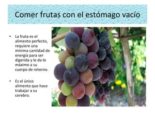Las frutas son el alimento perfecto y deben comerse siempre con el estómago vacío para que se digieran adecuadamente. Comer frutas por la mañana ayuda a limpiar el cuerpo y proporciona energía, en lugar de alimentos pesados como el pan y el café. Beber líquidos calientes en lugar de fríos también facilita la digestión.