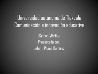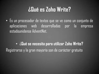 Zoho Write es un procesador de textos en línea gratuito que se puede acceder desde cualquier navegador. Los usuarios pueden crear y editar documentos de forma colaborativa en tiempo real sin necesidad de software adicional. Zoho Write ofrece características como almacenamiento en la nube, formato WYSIWYG, compatibilidad con varios formatos de archivo y edición simultánea por múltiples usuarios.