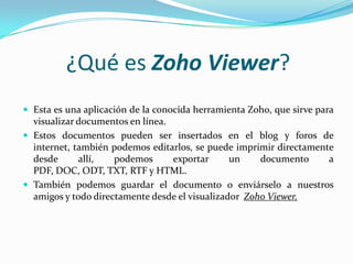 Zoho Viewer es una aplicación que permite visualizar documentos en línea, editarlos y compartirlos. Los usuarios pueden subir documentos como PDF, Word, PowerPoint y HTML directamente o introducir una URL. Una vez cargado, el documento se puede imprimir, exportar a diferentes formatos o compartir con otros.