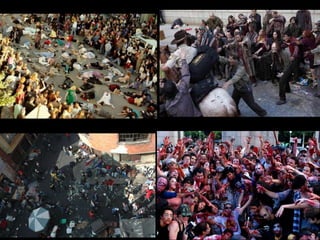 Este documento resume la historia y cultura de los zombis. Explica que el término proviene de lenguas africanas y cómo aparecieron en obras literarias y películas desde principios del siglo XX. George Romero popularizó el zombi moderno en películas de los 60-80. El antropólogo Wade Davis investigó el caso real de una persona zombificada en Haiti en los 80. Enfermedades como la rabia podrían explicar algunos casos. Las películas de zombis a menudo reflejan preocupaciones social