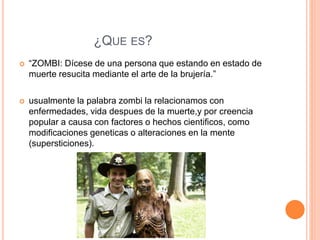Este documento explica lo que es un zombi desde diferentes perspectivas. Científicamente, se refiere a personas que parecen estar muertas pero que son revividas mediante venenos de peces que causan un estado de hibernación en el cerebro. También menciona la posibilidad de crear zombis a través de la brujería o mediante la unión de partes de diferentes cuerpos. Finalmente, la opinión es que aunque la vida después de la muerte es posible, los zombis serían seres sin alma que se mueven por ref