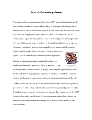 Vigotsky se refiere a la zona de desarrollo próximo (ZDP) como la distancia entre el nivel de desarrollo actual de un niño y su nivel de desarrollo potencial cuando recibe ayuda de un adulto o compañero más capaz. La ZDP es importante para el proceso de enseñanza-aprendizaje porque es donde se construye el conocimiento del alumno a través de la interacción social. La ZDP también se define como el espacio entre las habilidades lingüísticas que ya posee un niño y las que puede adqu