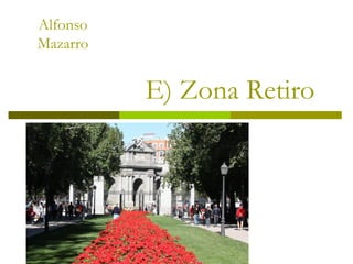 El documento presenta información sobre cinco puntos de interés en el Parque del Retiro en Madrid, España. Se mencionan la Puerta de Alcalá, la estatua del Ángel Caído, el Palacio de Cristal, las curiosidades más destacadas del parque y la antigua Casa de Fieras que albergaba un zoo. El texto invita al lector a explorar estos lugares y reflexionar sobre su historia y características.