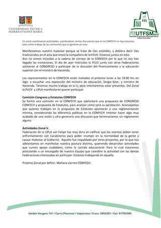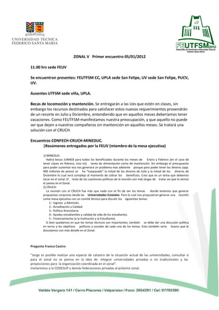 2) La FEUV informó sobre las reuniones con el CRUCH y el MINEDUC, en las que se abordaron temas como ingreso y admisión, acreditación, aranceles, ayudas estudiantiles y financiamiento de las universidades y estudiantes.
