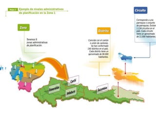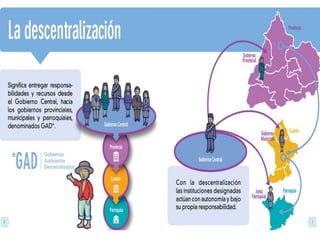 Las zonas administrativas del Ecuador fueron creadas para acercar el estado a la ciudadanía, mejorando la prestación de servicios y optimizando recursos. A través de una buena planificación y la participación de la población, se busca garantizar equidad territorial y asegurar el acceso cercano a servicios esenciales. Se implementará la desconcentración de servicios mediante seis ministerios, organizando distritos y circuitos identificados con códigos específicos para una mejor gestión.