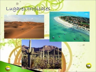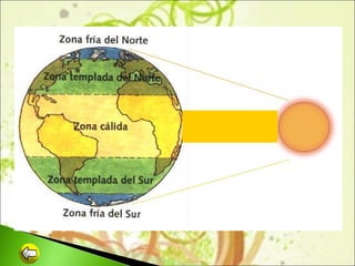 El documento describe las tres principales zonas climáticas de la Tierra: la zona cálida, ubicada alrededor de la línea del ecuador; las zonas templadas, entre los trópicos y los círculos polares; y las zonas frías, en los polos norte y sur, donde los rayos del sol llegan de manera muy inclinada y hace frío.