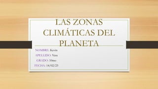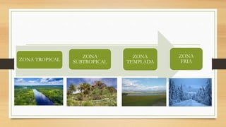 El documento describe las cuatro principales zonas climáticas de la Tierra: la zona tropical, la zona subtropical, la zona templada y la zona fría. La zona tropical se extiende entre los trópicos y recibe radiación solar casi vertical todo el año, lo que la hace muy caliente. La zona subtropical recibe más radiación en verano y menos humedad, lo que causa desiertos. La zona templada tiene temperaturas más frescas con estaciones distintas. La zona fría entre 60° y los polos recibe poca radiación solar en