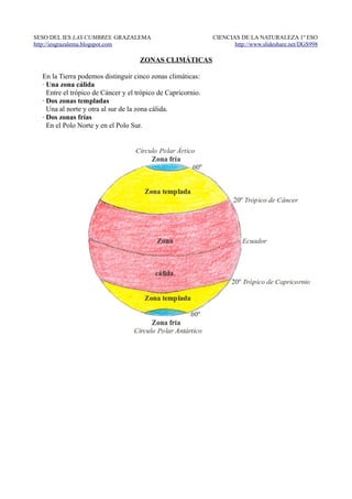 El documento describe las cinco principales zonas climáticas de la Tierra: la zona cálida entre los trópicos de Cáncer y Capricornio, las dos zonas templadas al norte y sur de la zona cálida, y las dos zonas frías en los polos norte y sur.