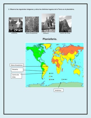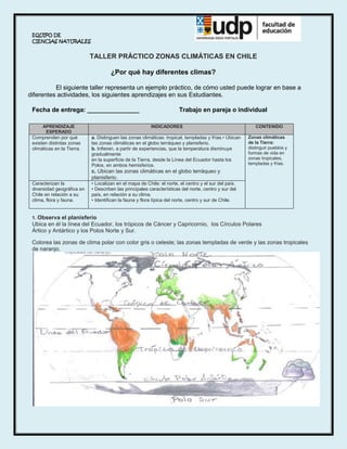 Este documento presenta un taller práctico sobre las zonas climáticas en Chile. El taller busca que los estudiantes comprendan por qué existen diferentes zonas climáticas en la Tierra y caractericen la diversidad geográfica de Chile en relación a su clima, flora y fauna. Incluye actividades como ubicar las zonas climáticas en un planisferio, comparar las temperaturas de diferentes lugares del mundo y completar cuadros sobre las características de cada zona climática.