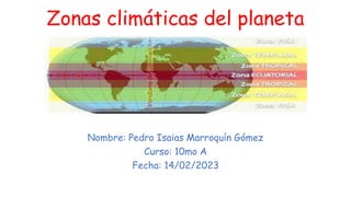 El documento describe las tres principales zonas climáticas de la Tierra: la zona fría, la zona tropical y la zona templada. La zona fría incluye las regiones polares alrededor de los polos, con clima nevado e hielo. La zona tropical se encuentra entre los trópicos de Cáncer y Capricornio, con clima cálido todo el año. La zona templada se ubica entre las zonas tropical y polar, con veranos e inviernos moderados y lluvias durante todo el año.